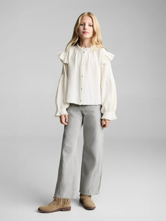 Girls Puff Sleeves Ruffled Cotton Shirt Style is a stylish kidswear outfit designed for comfort, durability, and a